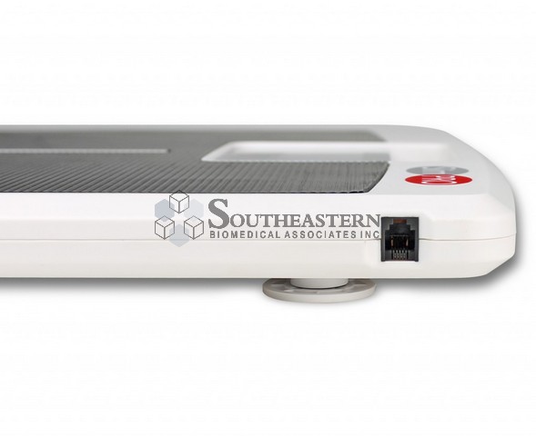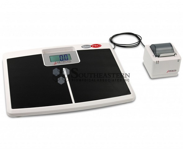 The SlimPRO digital low-profile scale’s extra-wide 17-in x 14.5-in/43-cm x 37-cm platform accommodates all sizes of patients and the large 1.5-in/38-mm high digits on the LCD are easy to read. The SlimPRO’s high 440-lb/200-kg capacity allows for bariatric weighing with an accuracy of 0.2-lb/100-g increments. The SlimPRO features a built-in carrying handle for portability, 5-second weight hold, foot pads for weighing on any surface (even carpets), 4 AAA batteries (included), Auto On/Off, pounds-kilograms units switching, easy-to-clean surface, and low-profile 1.4-in/36-mm slim depth for easy step-on weighing. The scale’s RS232 serial port allows connectivity with DETECTO’s optional P50 thermal tape printer or EMR/EHR software. With the serial connection, you may print on stable weight or send the data to a PC.